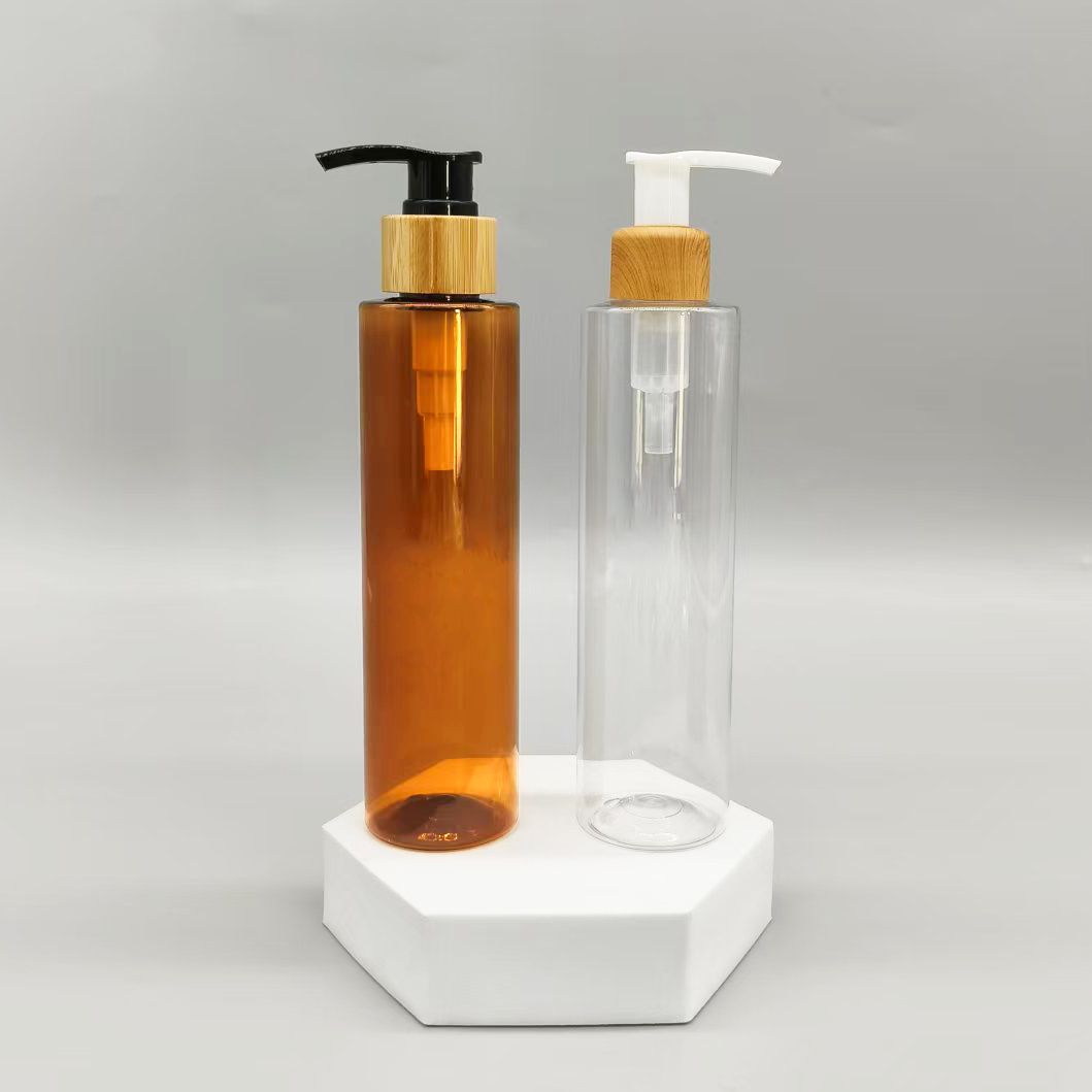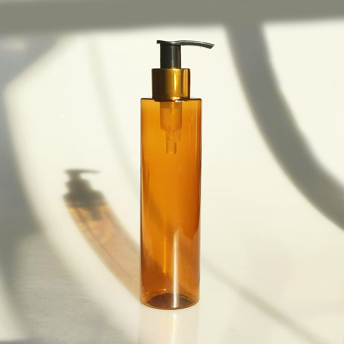 200ml Cylinder Flat Shoulder Brown PET Plastic Bottle with Lotion Pump/Press Top Cap/Pump Sprayer